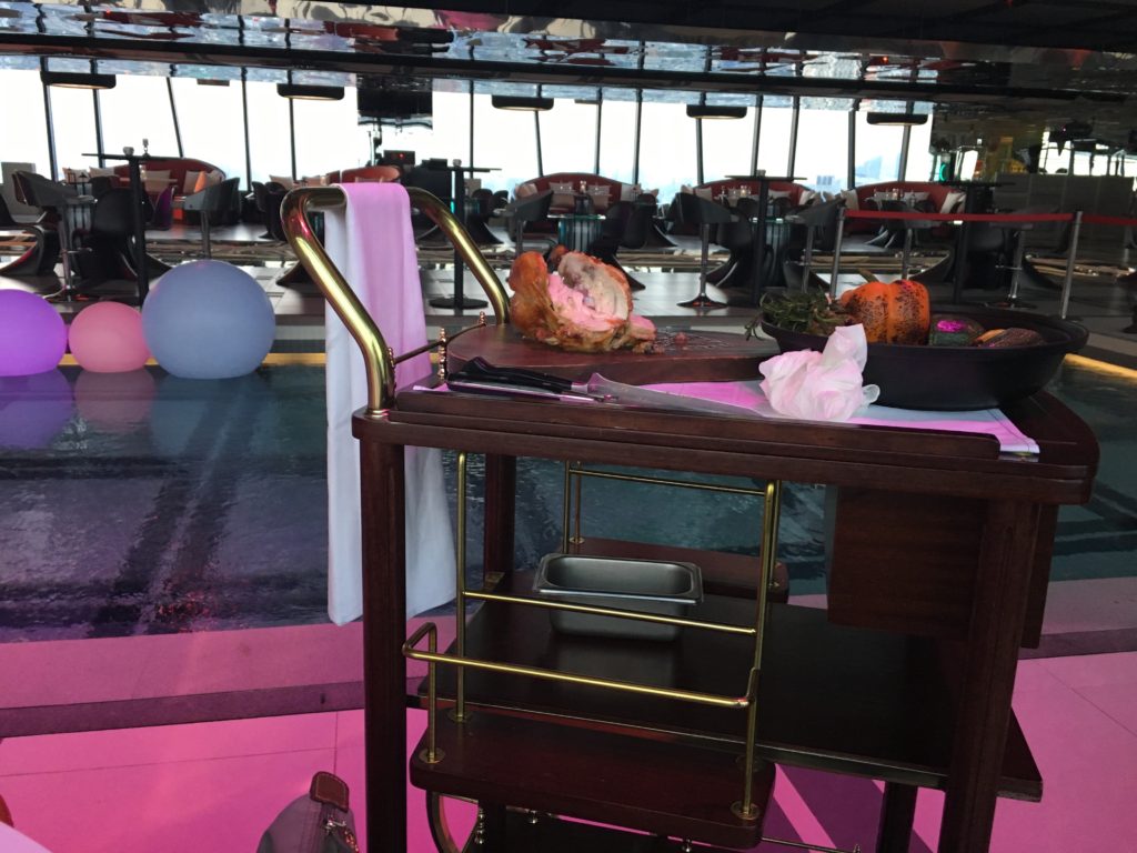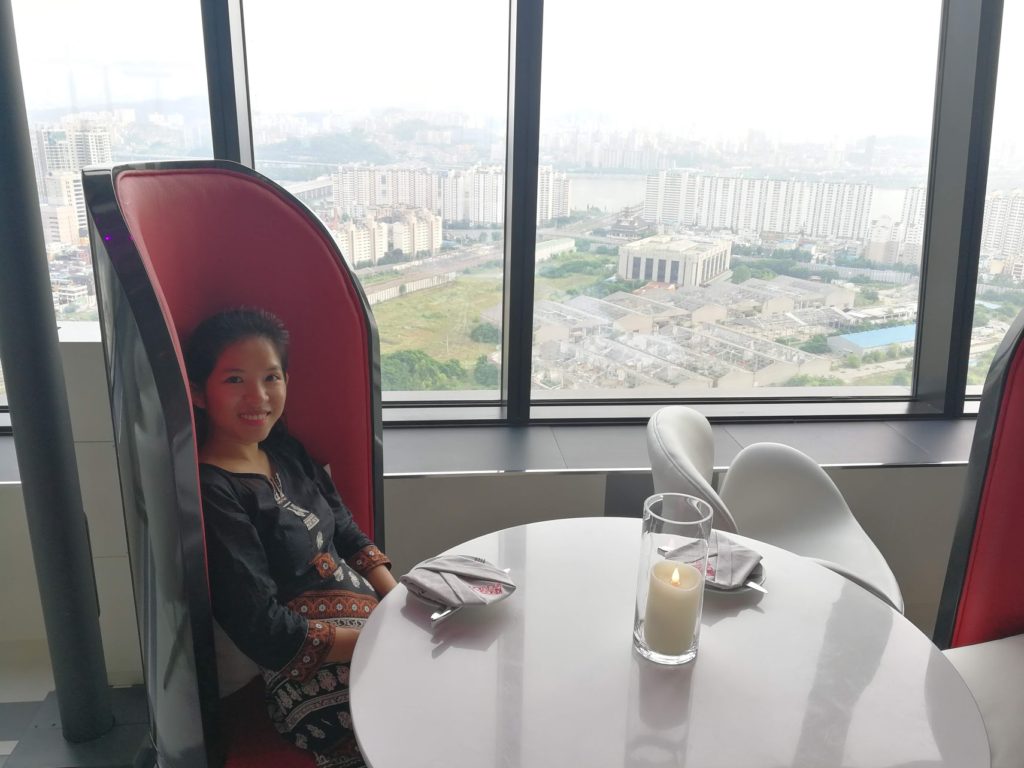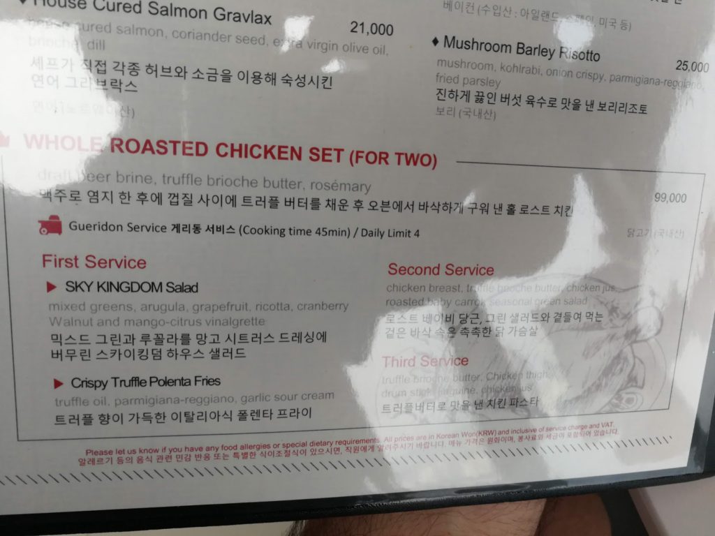 No dia seguinte, voltamos ao Sky Kingdom (31º andar) em Seul Dragon City. Já lhe falaram deste restaurante na ponte pedonal entre dois grandes edifícios. Desta vez, temos tempo para provar a especialidade deles:Conjunto de FrangoAssado Inteiro. Eles só vendem 4 por noite, e temos sorte de ter um para nós. O prato custa 99.000won, por 2