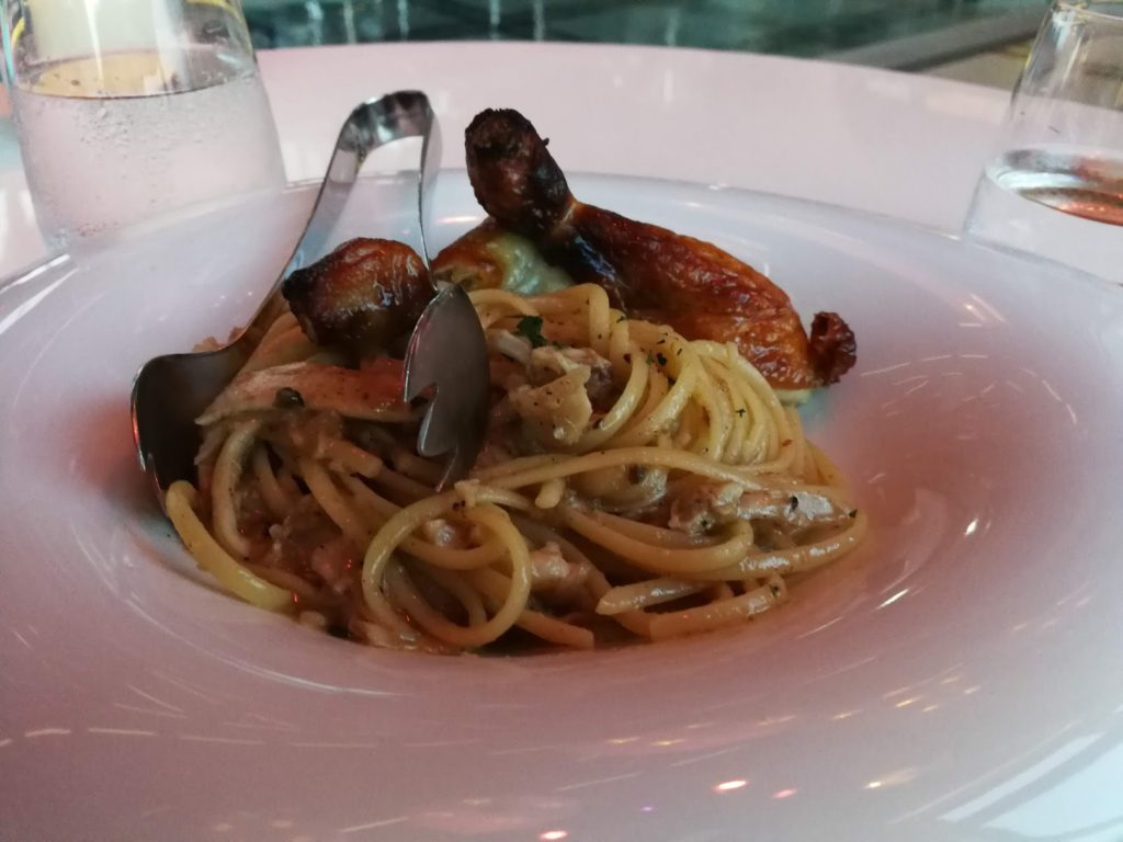 Então o esparguete é servido com o resto do frango, é bom demais!