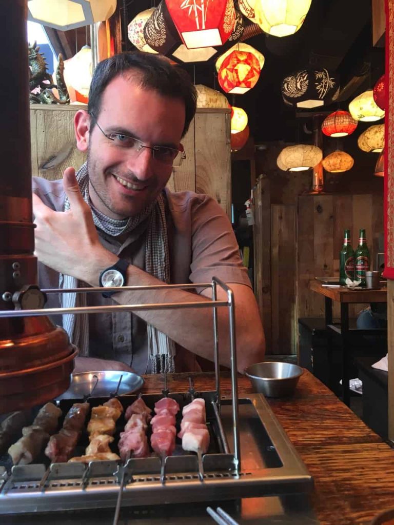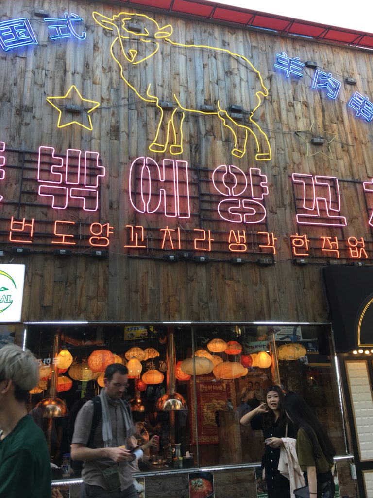 Em Seul, parece que há tantos tipos de churrascos quanto restaurantes. Voltamos ao distrito de Hongdae para testar os espetos de churrasco que vimos da última vez. O restaurante é muito pequeno e bem decorado (há muitas lanternas), está bem equipado e temos uma pequena máquina que nos faz girar os espetos. Quando o espeto estiver bem feito, tens de o colocar no alto da grelha