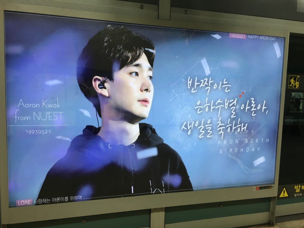 É o caso em todo o lado, mas está especialmente na moda no metro de Hongik ter cartazes publicitários… que consistem apenas em recordar aos fãs o aniversário desta estrela do K-pop ou deste actor/actriz. O cartaz dura cerca de um mês. E os fãs estão tão felizes por tirarem uma foto com ele