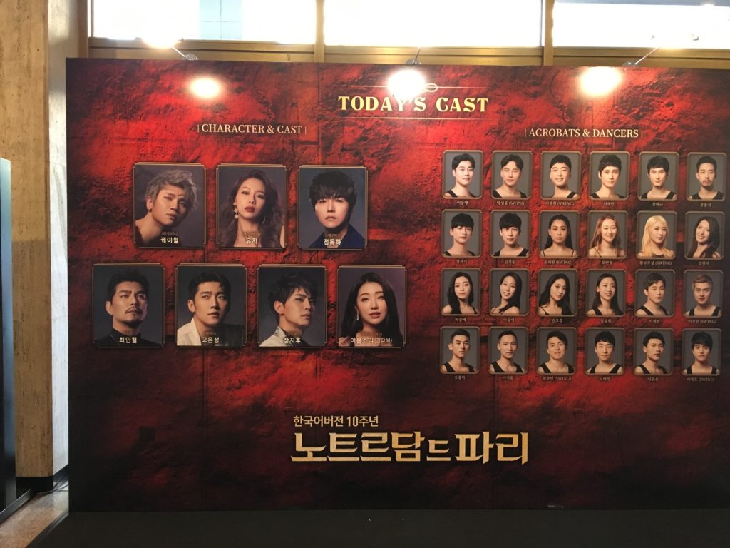 A encenação é exatamente a mesma que a da turnê da trupe francófona em 2017. Se bem me lembro, não tem nada a ver com a encenação original (que eu vi em DVD). Os ingressos ainda custam cerca de 80 euros cada, e o local está meio vazio (em um sábado). Talvez porque os coreanos ainda não estão habituados a ver musicais? ou porque este não é tão famoso como os outros (vimos os cartazes para Chicago, Frankenstein também)
