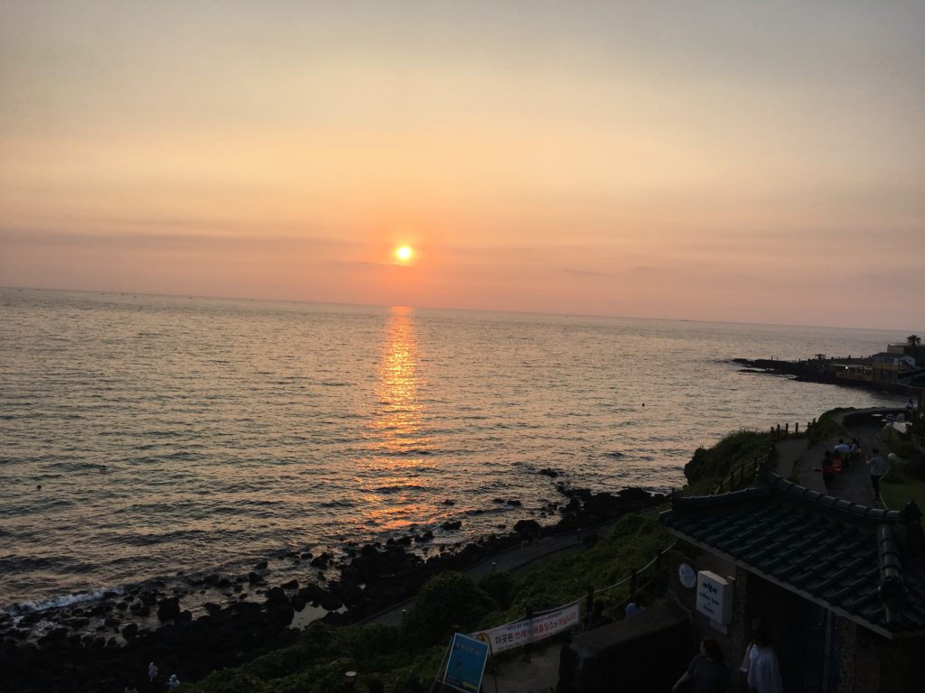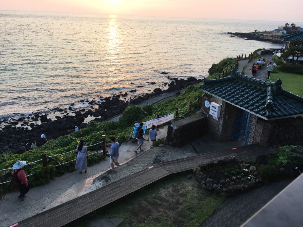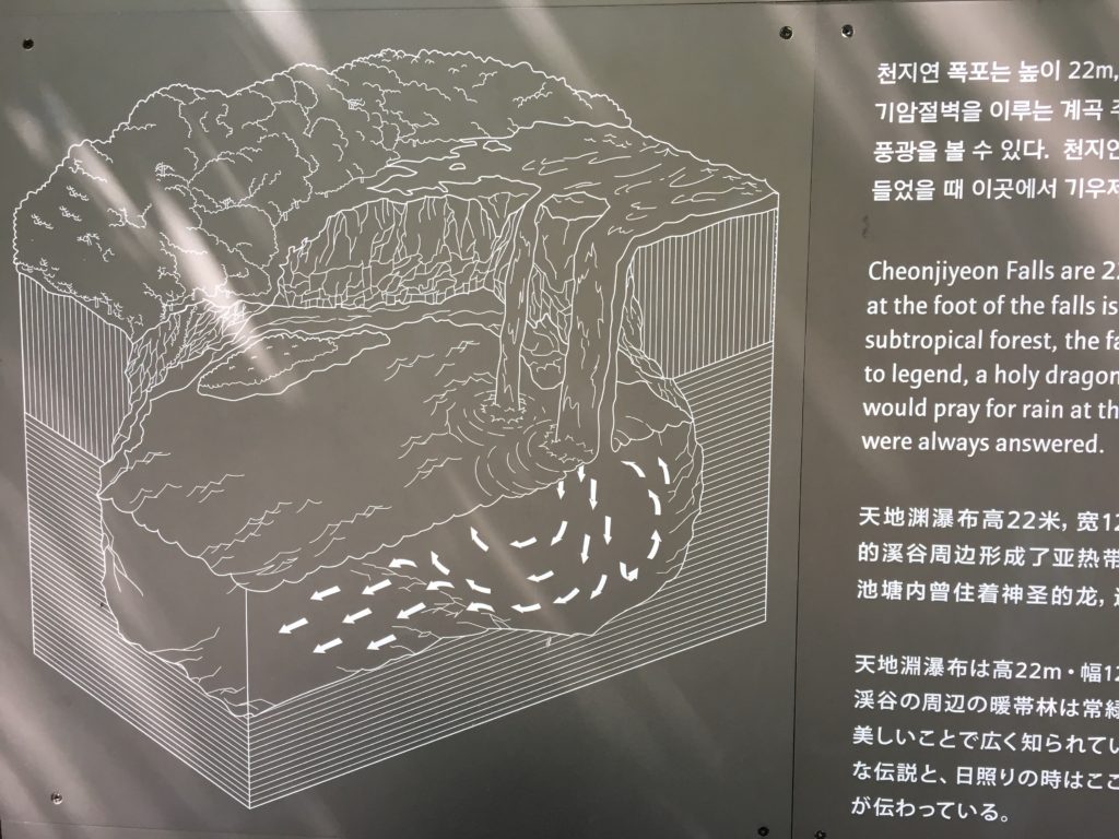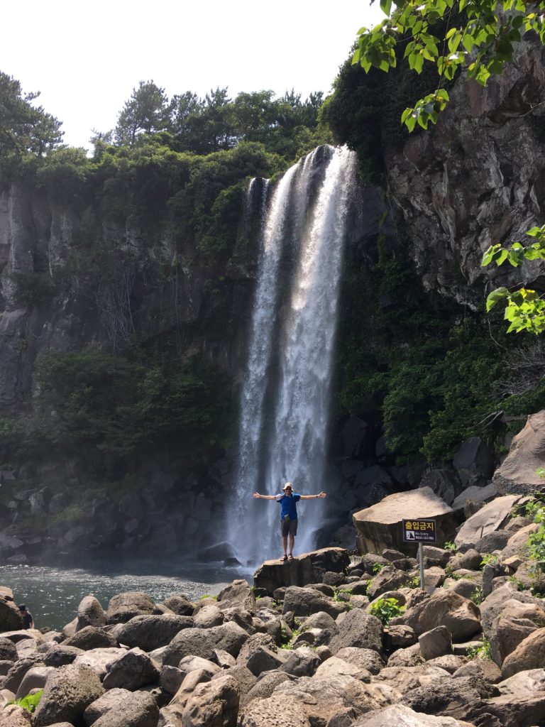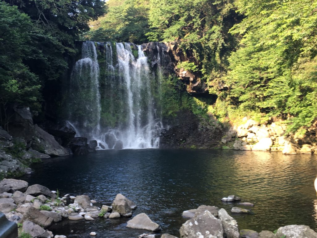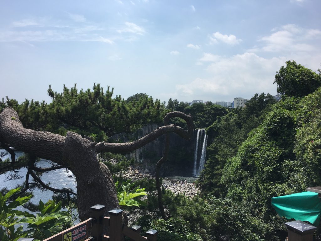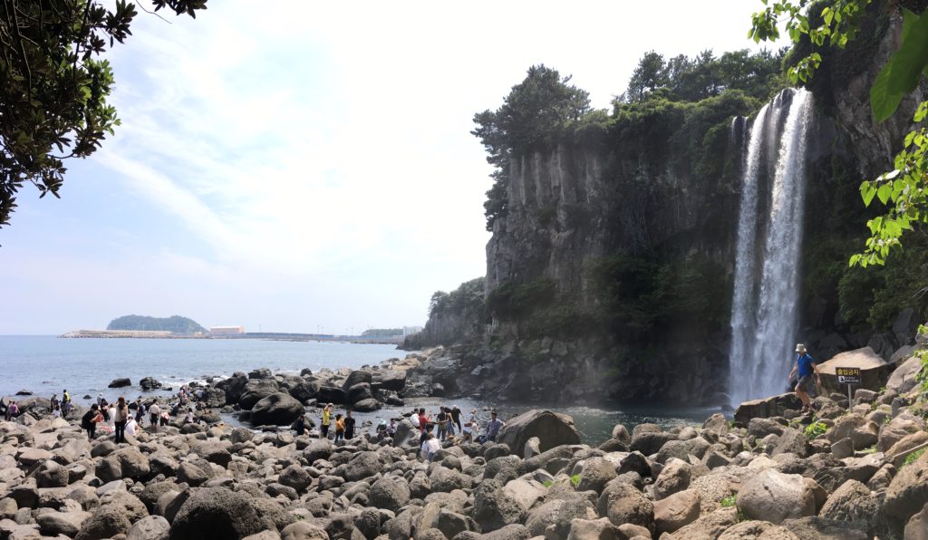 É a única cascata com vista directa para o mar na Coreia do Sul. Apesar da ausência de chuva, o fluxo é impressionante, é muito bonito! Sobre as rochas, há um pequeno restaurante efémero, acho que vendem conchas de sashimi.
