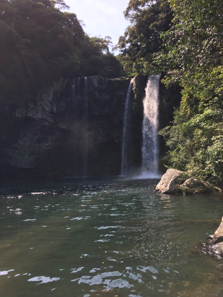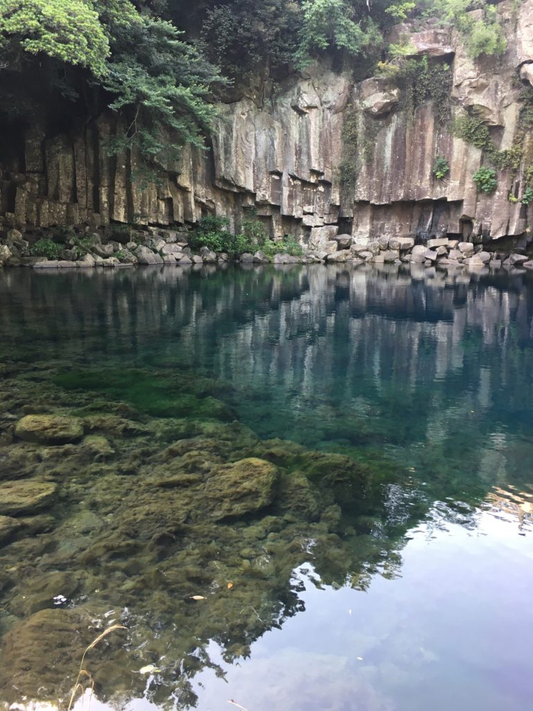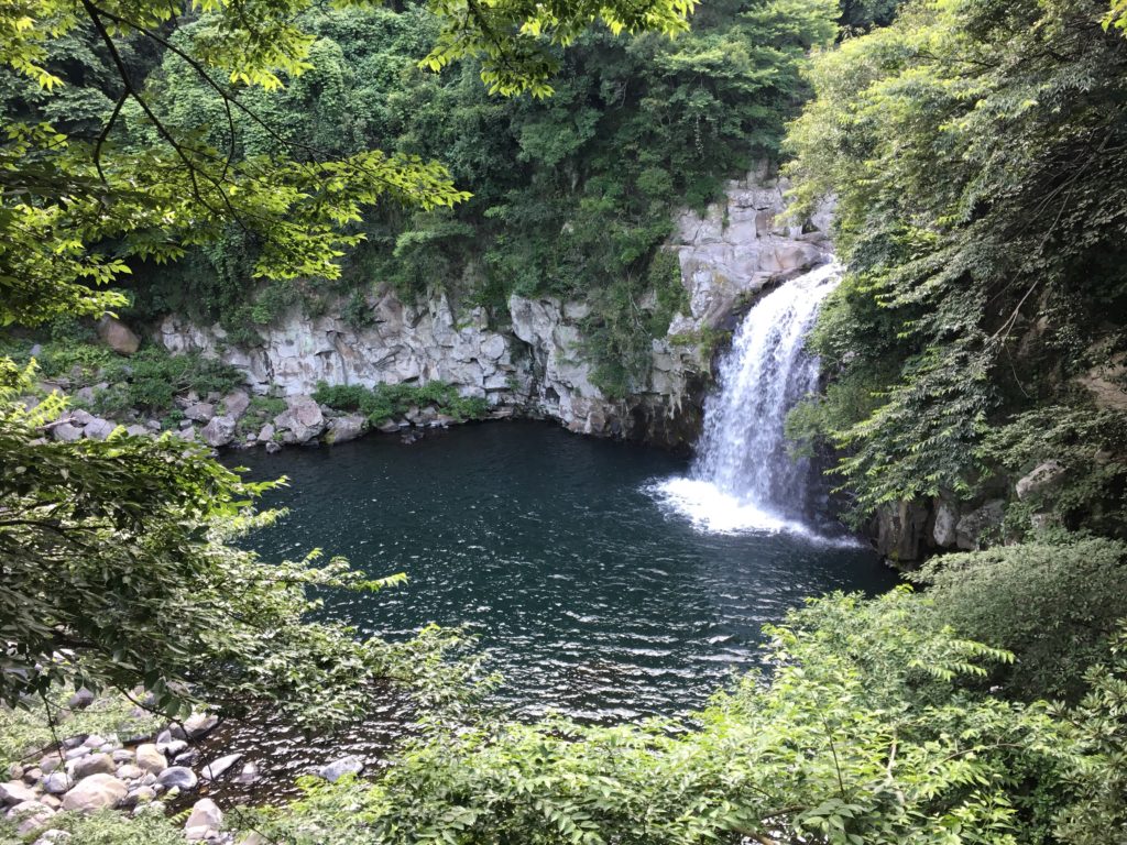 A primeira é Cheonjeyeon Falls, é apenas uma pequena cachoeira, mas as rochas à volta são impressionantes. Parecem-se com Tetris/colunas… alguns pedaços caíram, criando um espectáculo extraordinário (a forma lembra-nos o que vimos acima, no penhasco). A água é azul e transparente, dá vontade de nadar demais! Penso que era permitido no passado, mas criou um espectáculo tão caótico que eles preferem proibir o banho.