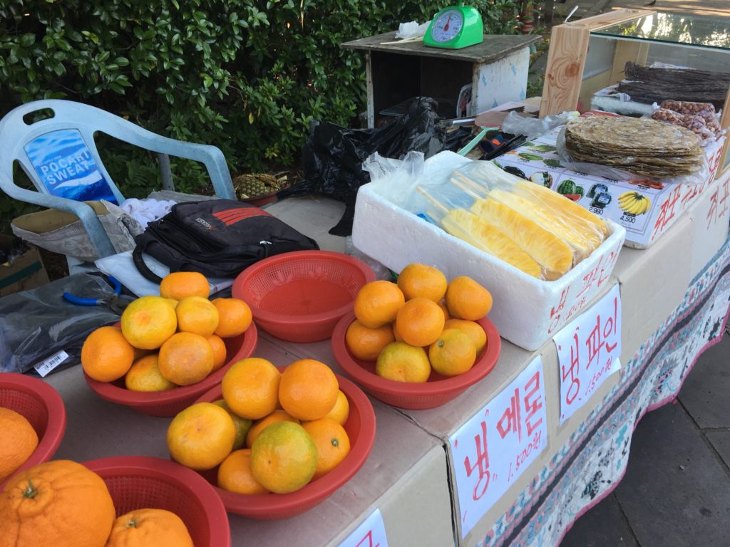 No nível da comida de rua, gostamos de degustar as frutas (que parecem vir do próprio Jeju) e o suco de laranja espremido.