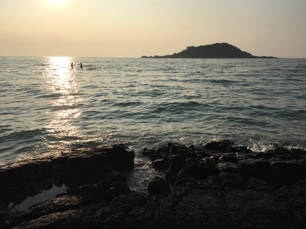 A areia é muito fina e super branca. Há poucas ondas e é pouco profundo. Mas os coreanos não gostam do sol, por isso tomam banho cobertos da cabeça aos pés.