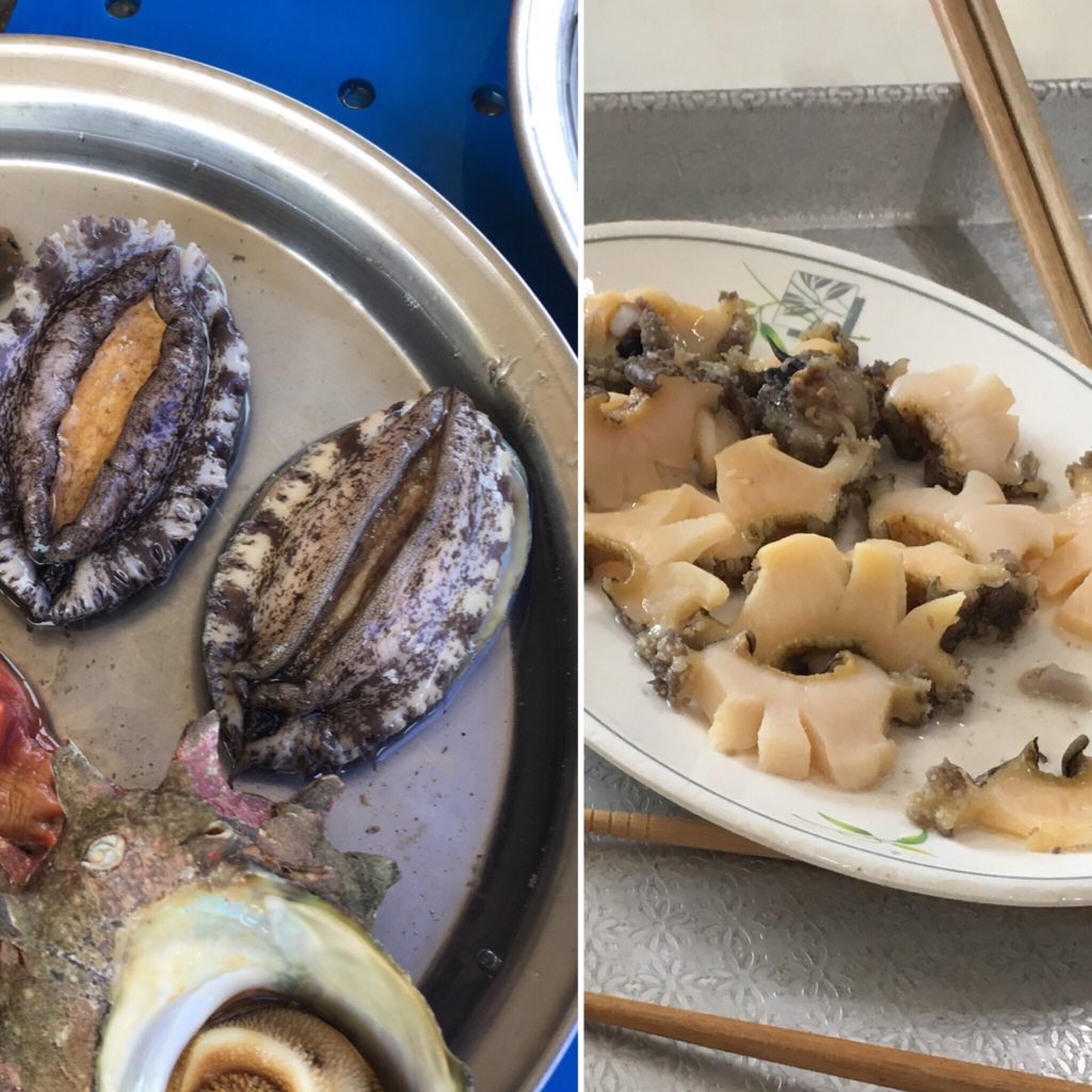 Nós escolhemos comer dois abalones, 10.000 won cada um. Esta é a especialidade do Jeju. A este preço, é muito barato, não se consegue encontrá-lo em mais lado nenhum do mundo. Eles contêm muito ômega-3