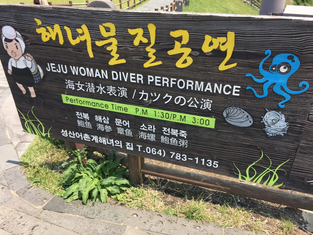No fundo, há uma placa de madeira indicando dois “shows” de Jeju Woman Divers