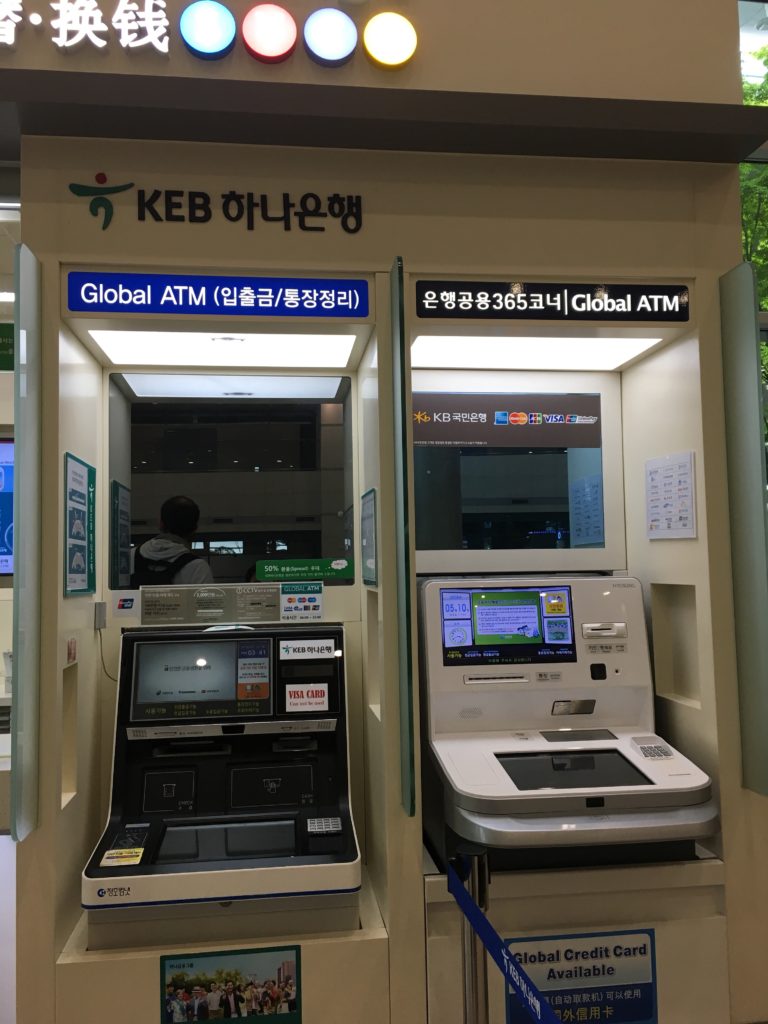 • Regra 3: As taxas não são as mesmas de um banco para outro. Eu tenho a opção internacional, ou seja, meu banco francês não me cobra nenhuma taxa de câmbio, mas para cada retirada aqui, você é obrigado a pagar taxas para o BANCO COREANO. O único caixa eletrônico que funcionou para o meu cartão no aeroporto me levou 7800won de 300.000won retirados (esquema! – é o da esquerda na foto). Encontrei o Woori Bank que só me levou 3.600 won por 500.000 won de levantamento