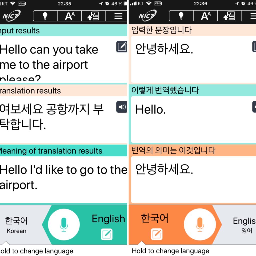 • VoiceTra (gratuito) – captura de tela abaixo: o reconhecimento de voz deste aplicativo (super poderoso e preciso) permite traduzir do coreano para o inglês, do inglês para o coreano. Super útil já que os coreanos são realmente maus em inglês e adoram falar conosco apenas em coreano. Você precisa de conexão (wifi,3G) para que o aplicativo funcione.